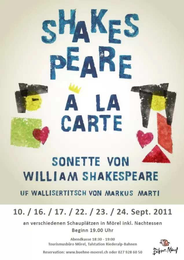 Einen Reigen von Rendezvous mit Shakespeares Sonetten an unterschiedlichen Schauplätzen in Mörel. Das Publikum wird von Schauplatz zu Schauplatz geführt. Bei den Sonetten handelt es sich um Gedichte, die vorgetragen, vorgesungen, vorgespielt werden. Alleine, zu zweit oder in der Gruppe. Markus Marti, in Visp aufgewachsen, ist der erste Nachdichter aus der Schweiz, der alle Sonette Shakespeares sowohl in Hochdeutsch wie auch im Walliserdeutsch im Druck vorlegt.